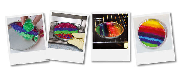 - Anschließend wird der Gegenstand wie gewohnt im Backofen geschmolzen, wobei die Colouraplastperlen verlaufen und fantastische Farbeffekte entstehen. Nach dem Schmelzvorgang lassen Sie den Gegenstand im Backofen bei geschlossener Backofentür auskühlen, um Risse in der Oberfläche zu vermeiden.