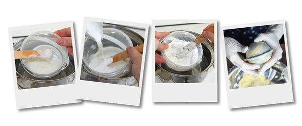 Die Badekugelmasse lässt sich auch perfekt in Förmchen, z.B. Badehupferl (Art.57823) drücken.