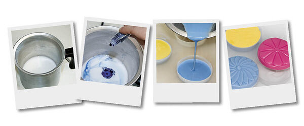 Nehmen Sie das Schmelzgefäß aus dem Topf. Die flüssige Seife kann nun in kleine Portionen aufgeteilt, beliebig eingefärbt und beduftet werden (Zugabe 1-3% je nach gewünschter Intensität).