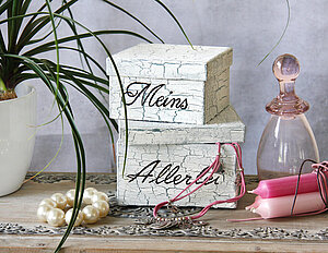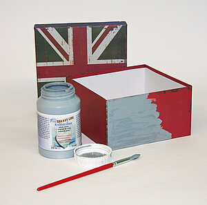 - Bild 1: Schachtel mit Kreidecolour (Art. 71 842) oder Basiscolour (Art. 71 841) grundieren. Gut trocknen lassen (je nach Untergrund ca. 2 Stunden)