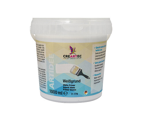 Viele saugende Untergründe lassen sich besser bearbeiten, wenn diese mit Weißgrund vorbehandelt werden. Die Spezialgrundierung verbindet sich fest mit dem Untergrund des Werkstoffes und gleicht aufgrund ihrer cremigen Konsistenz kleine Unebenheiten perfekt aus. Die trockene Weißgrundfläche wird mit Schleifpapier etwas angeschliffen und nach Belieben weiter bearbeitet.