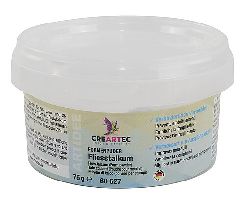Konservierungsmittel für PU-, Latex- und Silikonformen. Verhindert ein Verspröden der Formen. Fließtalkum wird mit einem weichen Pinsel in der Form verteilt. Die enthaltenen Bärlappsporen fördern das Fließvermögen von flüssigem Zinn in Silikonformen.