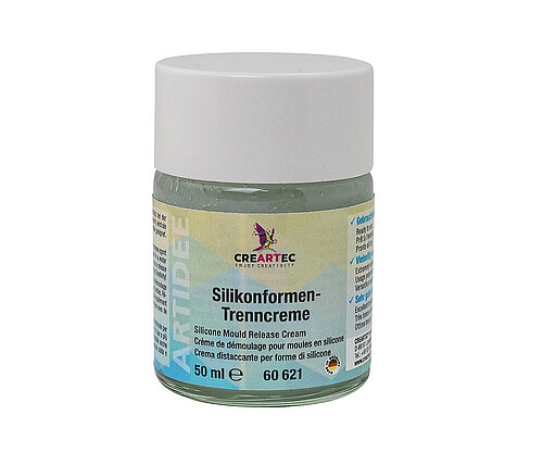 Silikonformen-Trenncreme ist der optimale Trennschutz bei der Herstellung von zwei-oder mehrteiligen Silikonformen. Im Wasserbad erwärmte wird sie dünnflüssig und ist leicht zu verstreichen. Auch als Trennmittel für Gipsteile geeignet. Pinselreinigung erfolgt mit heißem Seifenwasser.