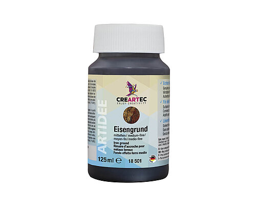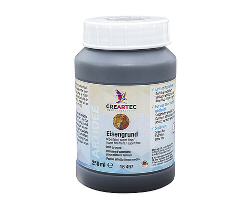 Gestalten Sie einfach authentische Rosteffekte. Den Eisengrund mit einem Pinsel dünn auftragen, 2-3 min antrocknen lassen und danach mit einer deckenden Schicht überziehen. Nach dem Trocknen Eisengrund mit Oxidationsmittel (Art. 18601) überstreichen. Der typische Rosteffekt entwickelt sich in kurzer Zeit. Für optimale Haftung des Eisengrundes Gegenstände aus Glas, Metall oder Kunststoff mit Universal-Haftgrund (Art. 71801) vorbehandeln.