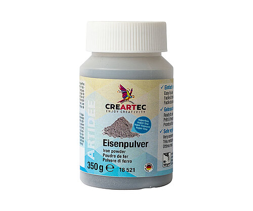 Das Eisenpulver eignet sich hervorragend als Ergänzungsmaterial um rustikale rostige Oberflächen schnell und einfach herzustellen. Eisenpulver wird in Eisengrund (Art. 18501) eingearbeitet um diesen dickflüssiger und spachtelbar zu machen. Durch einfaches Aufstreuen oder Einarbeiten auf die mit Eisengrund bearbeitete Fläche kreieren Sie gezielt einzigartige Rostspuren.
