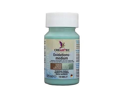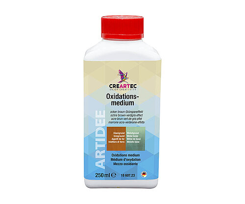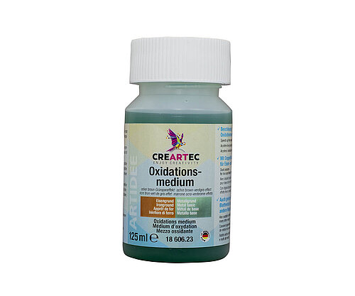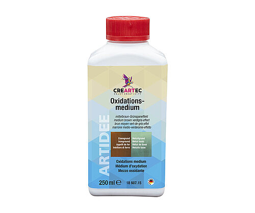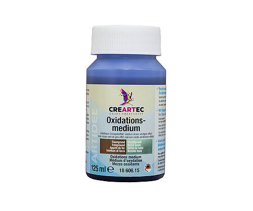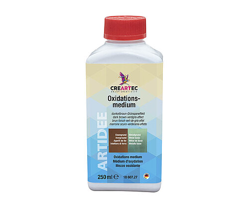 Die mit Eisen- oder Metallgrund vorbehandelten Oberflächen werden mit Oxidationsmedium dünn überstrichen. Kurze Zeit später werden bereits erste Verfärbungen sichtbar. Oxidationsmedium ist auch auf Blattmetall (Art. 42901) und vielen anderen Metallen anwendbar. Viele Tipps finden Sie im Anleitungsheft <link https: www.creartec.de fileadmin creartec produkte metalloxidation external-link-new-window external link in new>„Metalloxidation“. Die Farbwirkung kann je nach Untergrund, Auftragsmenge und Einwirkdauer leicht abweichen. Vor Gebrauch gründlich aufrühren!