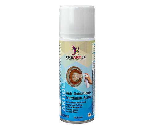Der hochwertige Anti-Oxidations-Mattfinish-Spray eignet sich besonders gut als schützendes Schlussfinish für patinierte, vergoldete oder mit Rost und Grünspan veredelte Objekte. Durch einfaches Aufsprühen entsteht ein wirkungsvoller Schutz vor Witterungseinflüssen, Farbveränderungen oder ungewolltem Nachoxidieren. Dadurch wird das Aussehen der damit behandelten Gegenstände voll erhalten. Durch den Auftrag erhalten die Teile ein seidenmattes, natürlich wirkendes Oberflächenfinish.
