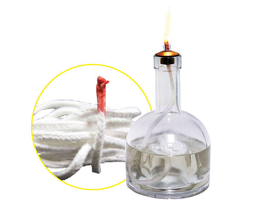 Rundförmig gesponnener Baumwolldocht – naturfarbig – zum Einstecken in den Lampenbrenner. Das rot markierte Dochtende zeigt die Spitze des Dochtes an. Der Docht muss so durch die Öffnung des Brennkopfes gefädelt werden und zwar so, dass das rote Dochtende aus dem Brennerkopf herausragt. Vorteilhaft ist es, wenn der Docht vor dem Gebrauch in die Brennflüssigkeit (Lampenöl) eingetaucht wird und sich damit vollsaugt. Das sorgt für ein konstantes Nachfließen des Lampenöls.