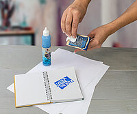 Stempelfläche mit Stempelreiniger benetzen, mit einer weichen Bürste oder einem Tuch reinigen und mit warmem Wasser nachspülen. Ideal für alle Stempelarten.